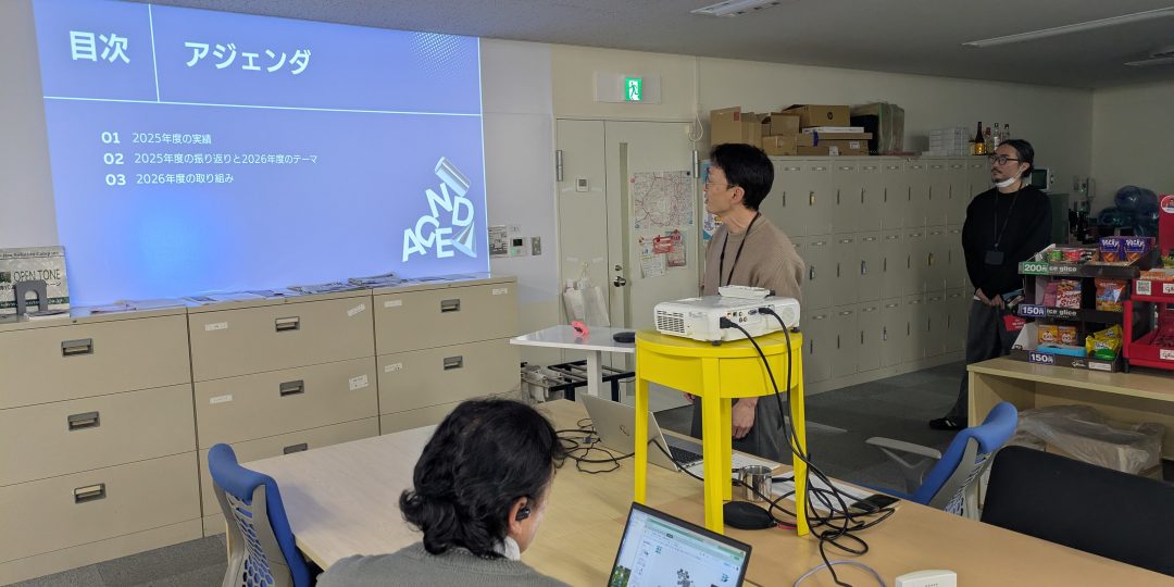写真は、当社の社員総会と懇親会の様子です。当社2月が期初ですので、全社員で集まり会社と各事業部、各種委員会などの1年間の事業方針・計画を共有します。